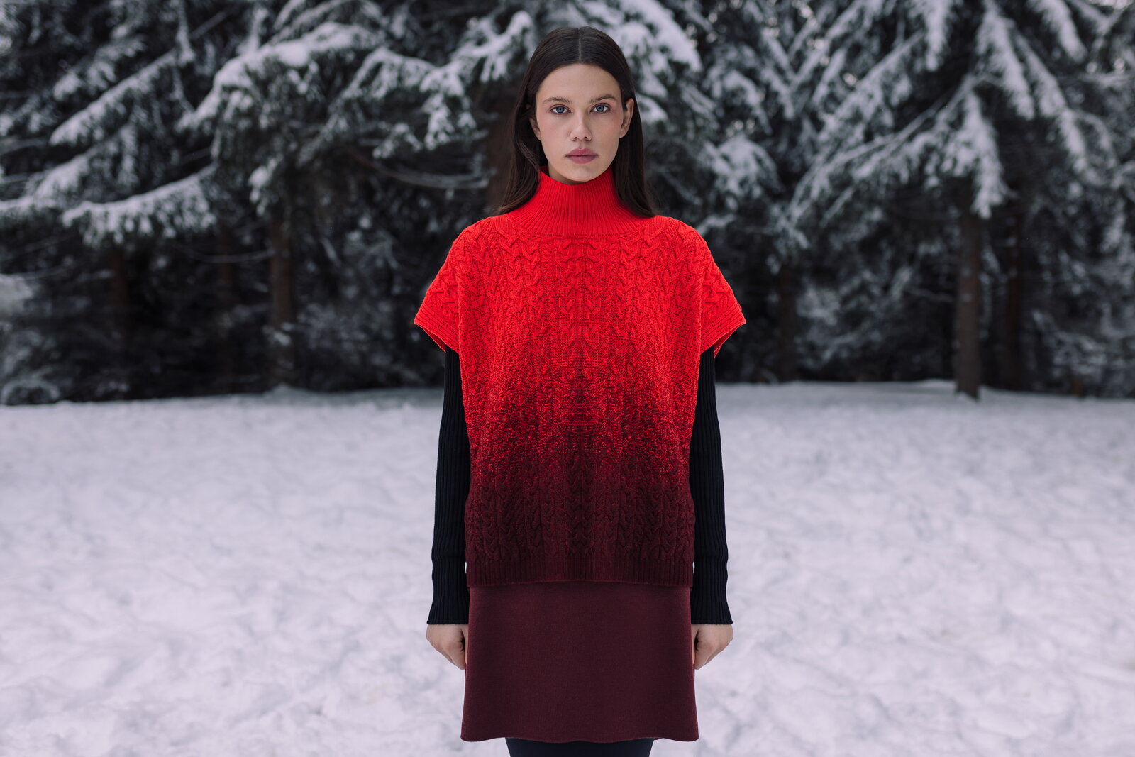 Wool and cotton vest with Murmurations motif bringing rhythm and movement. High roll-neck adds warmth, while shaped armholes and hem keep form. Standard fit ensures comfort.